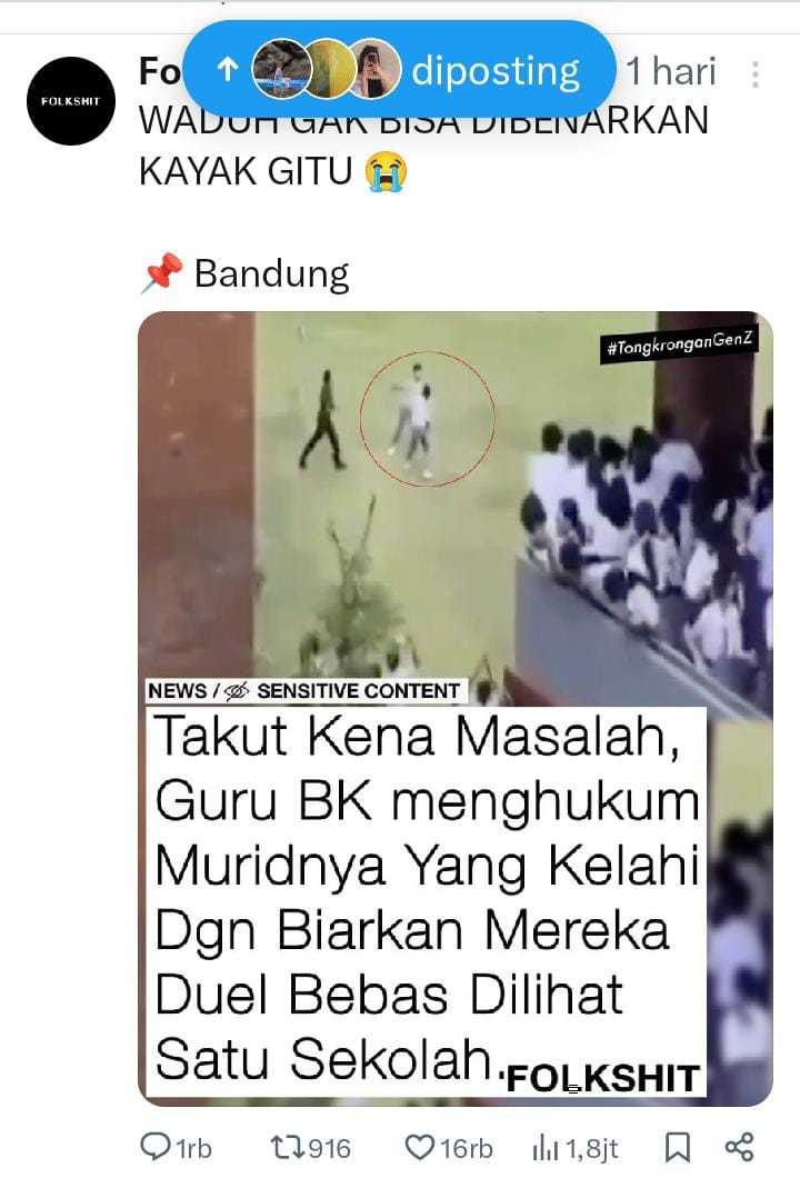 “Sepertinya guru tidak mau pusahkan takut di keroyok oleh Siswa itu”, katanya akun @Folkshitt.